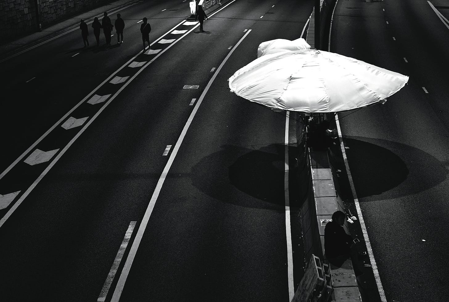 An umbrella on an overpass.