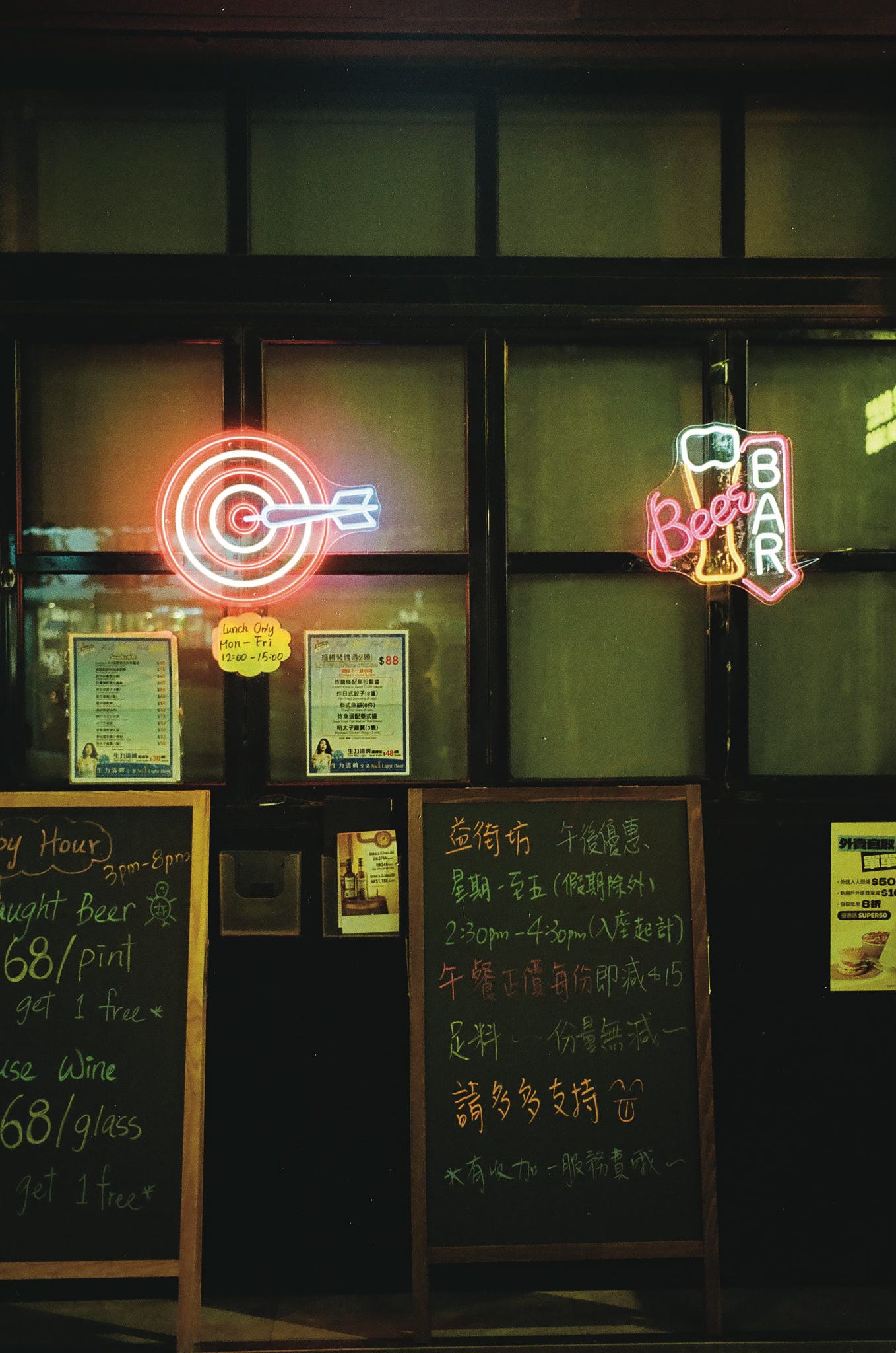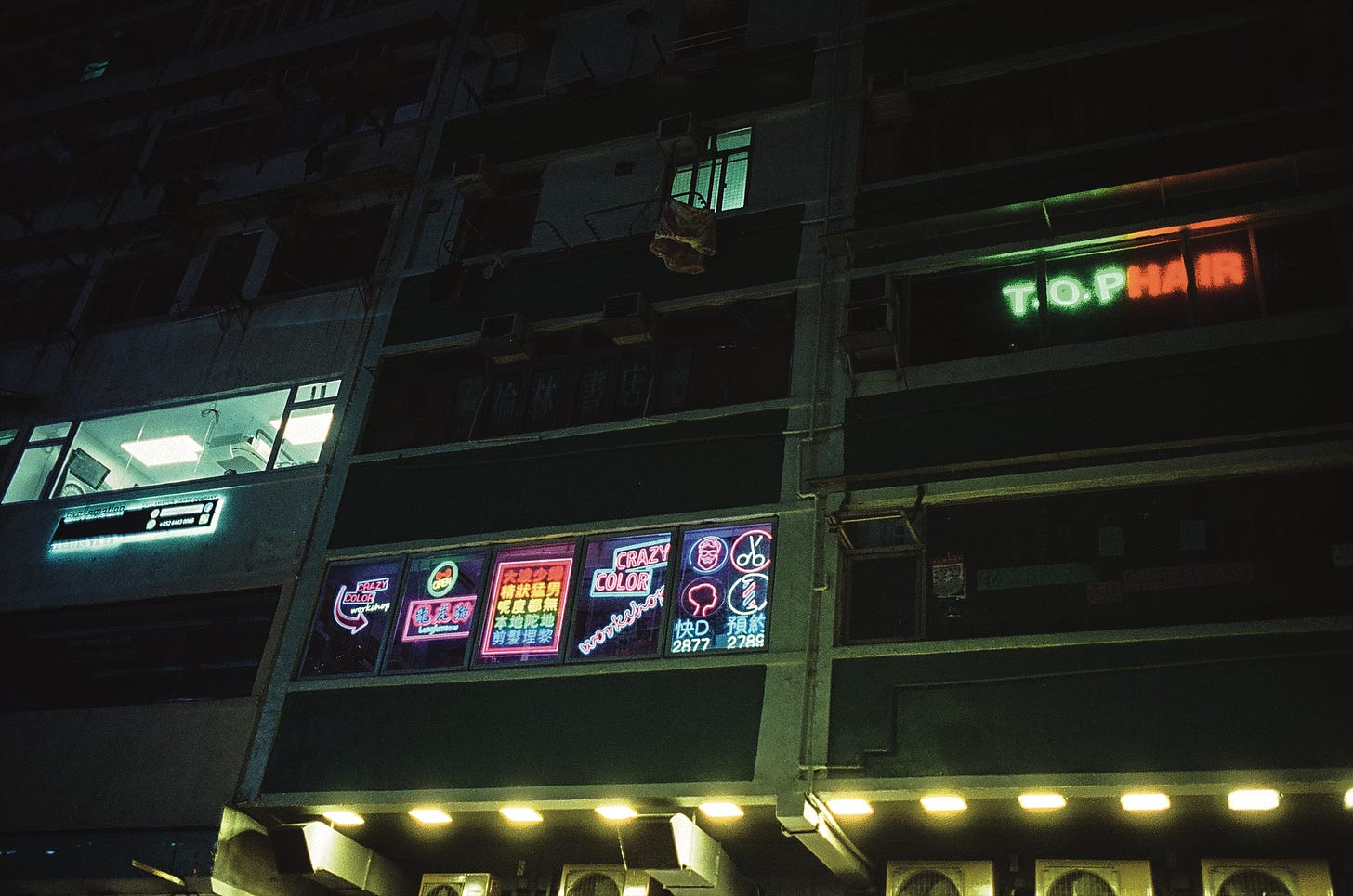 Barber shops. The neon signs on the lower level are kinda funny.