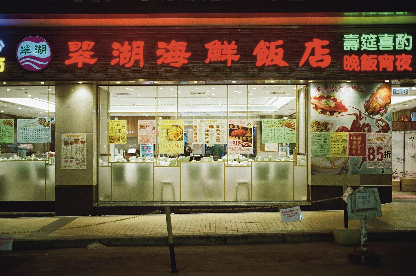 A seafood restaurant at night.