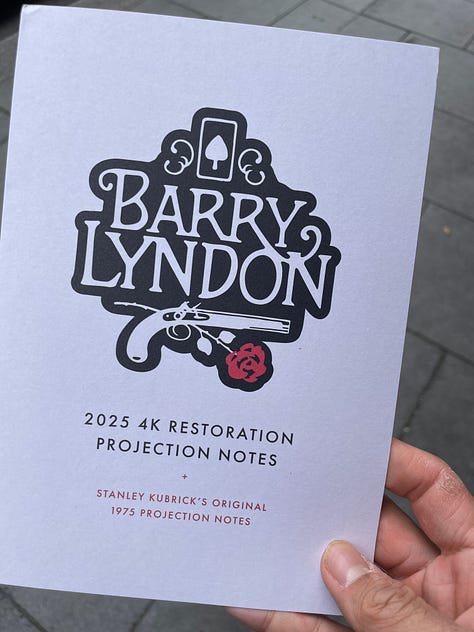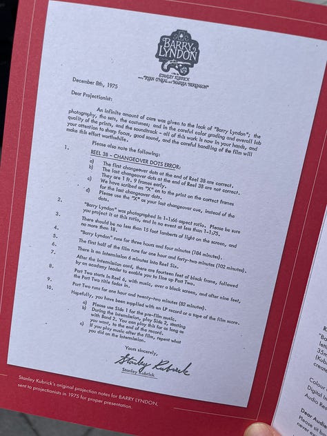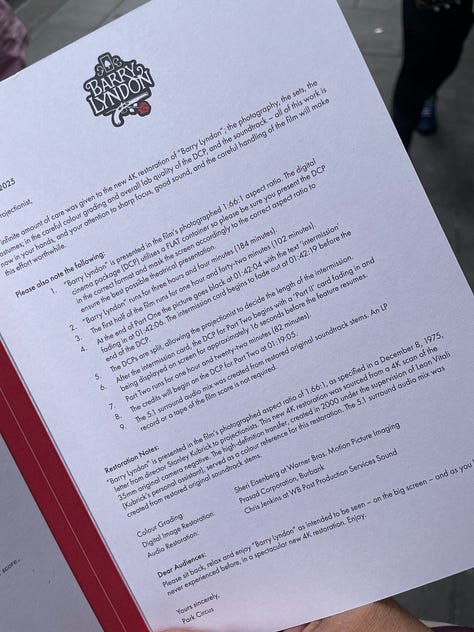 The theatre also prepared a little keepsake for this anniversary release at the ticket counter, a little folded card with two notes to the projectionists, the 1975 original by Stanley Kubrick, and a new updated version for the 4K re-release. It’s a small thing, but it is a nice gesture and lends the theatre experience a bit more depths.